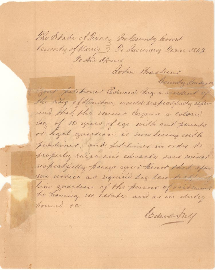 This artificial collection is a sampling of the case files from the Justice (20 Cases), County (ca. 175 Cases), and District (17 Cases) courts of Harris County from its first three decades, 1837-1867. While most case documents are from the Republic of Texas (especially 1838), there are several from the 1850s and a small sampling from Reconstruction, but none from the Civil War period. Together the files create an incomplete yet tantalizing picture of early Harris County and are an important addition to manuscript resources available to the study of Texas legal and social history.