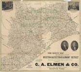 This Survey Map shows every section of land in the Houston-Galveston-Beaumont District. The Rain and Orange Belt of South Texas. Compliments of C. A. Elem & Co., Largest Land Dealers in Texas, Houston, Texas. Original size 41 x 37 inches.
